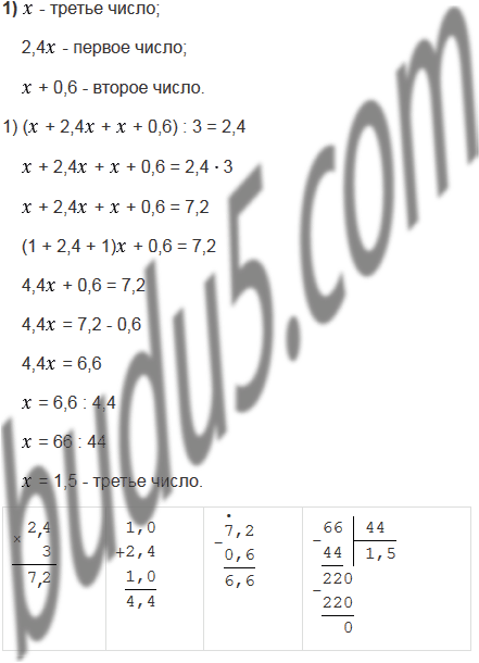 1) Первое число в 2,4 раза больше третьего, а второе число на 0,6 больше третьего числа. Найдите эти три числа, если их среднее арифметическое равно 2,4.