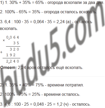 1) Площадь огорода 6,4 а. В первый день вскопали 30% огорода, а во второй день - 35% огорода. Сколько аров осталось ещё вскопать?