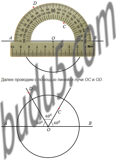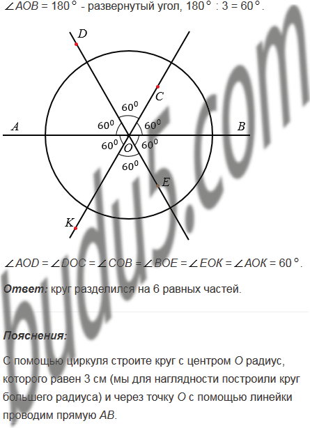 Начертите круг радиусом 3 см. Обозначьте его центр буквой О. Проведите через точку О прямую АВ. С помощью транспортира разделите развернутые углы АОВ с обеих сторон прямой на 3 равных угла. На сколько равных частей разделился круг?