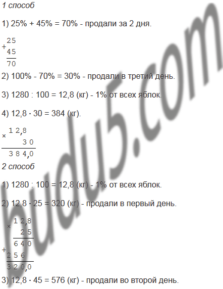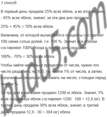 За три дня в магазине продано 1280 кг яблок. В первый день продали 25% всех яблок, а во второй день - 45% всех яблок. Сколько килограммов яблок продали в третий день? Решите задачу двумя способами. Какой из этих способов проще?