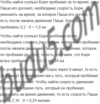 Паша пустился догонять Борю, когда тот отбежал от него на 360 м, и догнал через 9 мин. С какой скоростью бежал Паша, если скорость Бори была 0,2 км/мин?