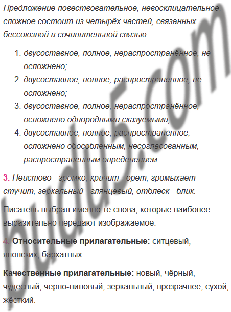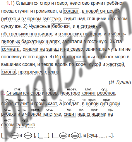 1) Слышится спор и говор, неистово кричит ребёнок, поезд стучит и громыхает, а солдат, в новой ситцевой рубахе и в чёрном галстуке, сидит над спящими на своём сундучке. 2) Чудесные бабочки, и в ситцевых пёстреньких платьицах, и в японских нарядах, и в чёрно-лиловых бархатных шалях, залетали в гостиную. 3)Эта комната, окнами на запад и на север, занимала чуть ли не половину всего дома. 4) Играл зеркальный отблеск моря в вышинах сосен, и текла вдоль по коре, сухой и жёсткой, смола, прозрачнее стекла.