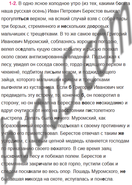 В одно ясное холодное утро (из тех, какими б..гата наша русская осень) Иван Петрович Бе́рестов выехал прогуля(тся, ться) верхом на всякий случай взяв с собой пары три борзы́х, стремянного и (не)скольких дв..ровых мальчишек с трещ..тками. В то же самое время Григорий Иванович Муромский соблазнясь хорошею погодою велел ос..длать куцую свою кобылку и рысью поехал около своих англизированных владений. Подъезжая к лесу увидел он соседа своего гордо с..дящего верхом в чекмене́ подбитом лис..им мехом, и поджидающего зайца, которого мальчишки криком и трещ..тками выг..няли из кустарн..ка. Если(б) Григорий Иванович мог предвидеть эту встречу то конечно(б) он поворотил в сторону; но он наехал на Берестова (во)все (не)ожида(н, нн)о и вдруг очутился от него на ра..тоянии п..столетного выстрела. Делать было (не)чего: Муромский как образова(н, нн)ый европеец под..ехал к своему противнику и учтиво его приветствовал. Берестов отвечал с таким(же) усерд..ем, с каковым цепной медведь кланяется господам по приказанию своего в..жатого. В сие время заяц выск..чил из лесу и побежал полем. Берестов и стремянный закр..чали во всё горло пустили собак и следом поск..кали во весь опор. Лошадь Муромского (не)бывавшая (ни)когда на охоте испугалась и пон..сла. Муромский провозгласивший себя отличным наездником дал ей волю и внутренне доволен был случаем избавляющим его от (не)приятного собеседника.