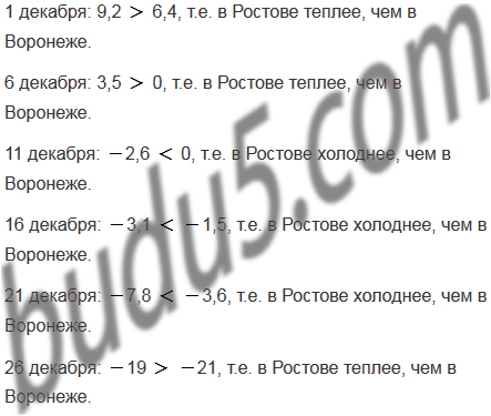 В Ростове и Воронеже измеряли температуру 1, 6, 11, 16, 21 и 26 декабря в 12 ч дня. Результаты (в градусах Цельсия) указаны в таблице. Сравните температуру в Ростове и Воронеже в одно и то же время.