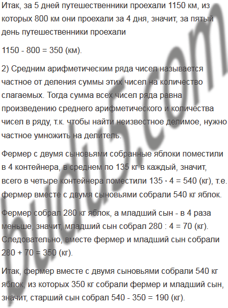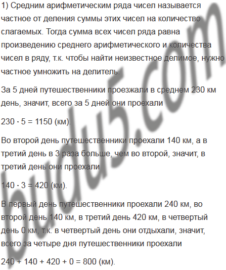1) В первый день путешественники проехали 240 км, во второй день 140 км, в третий день они проехали в 3 раза больше, чем во второй, а в четвертый день они отдыхали. Сколько километров они проехали в пятый день, если за 5 дней они проезжали в среднем 230 км день?