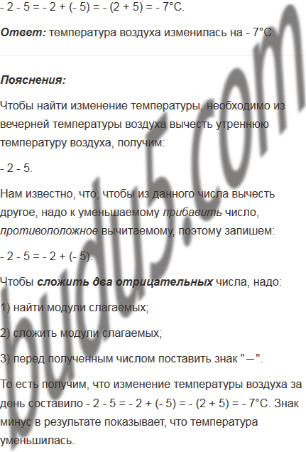 Температура воздуха утром была 5°С, а к вечеру она стала равной - 2°С. На сколько градусов изменилась температура воздуха за день?