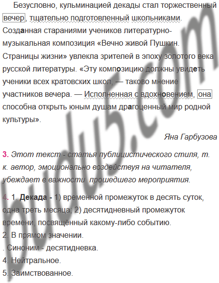 Безусловно, кульминацией декады стал торжественный вечер, тщательно подготовленный школьниками. Созд..нная стараниями учеников литературно-музыкальная композиция «Вечно живой Пушкин. Страницы жизни» увлекла зрителей в эпоху золотого века русской литературы. «Эту комп..зицию должны увид..ть ученики всех кратовских школ — таково мнение участников вечера. — Исполненная с вдохн..веиием, она способна открыть юным душам др..гоценный мир родной культуры ».