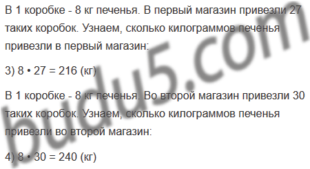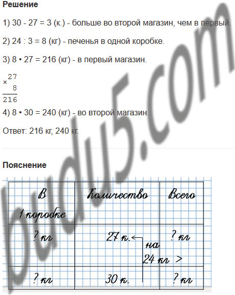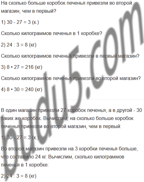 2. В один магазин привезли 27 коробок печенья, а в другой - 30 таких же коробок. Во второй магазин привезли на 24 кг печенья больше, чем в первый. Сколько килограммов печенья привезли в каждый магазин?