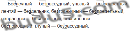 Бе..печный — (...), унылый — (...), лентяй — (...), безграничный — (...), напрасный — (...), бе..сильный — (...), глупый — (...).
