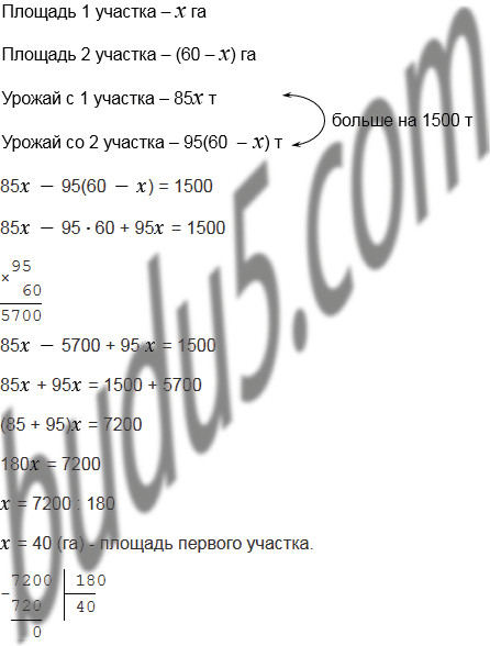 Площадь двух участков, засеянных кукурузой, равна 60 га. На одном участке с каждого гектара собрали 85 т зеленой массы, а на другом - 95 т. С первого участка собрали на 1500 т больше, чем со второго. Найдите площадь каждого участка.