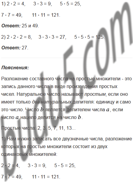 Запишите все двузначные числа, разложение которых на простые множители состоит: 1) из двух одинаковых множителей; 2) из трех одинаковых множителей.