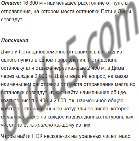 Дима и Петя одновременно отправились в поход из одного пункта в одном направлении. Петя делала остановку для отдыха через каждые 2 400 м, а Дима через каждые 2 800 м. На каком наименьшем расстоянии от пункта отправления места их остановки совпадут?