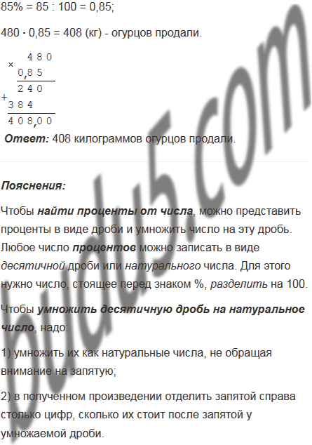 Магазин продал 480 кг огурцов и помидоров, причём огурцы составляли 85% этих овощей. Сколько килограммов огурцов продали?