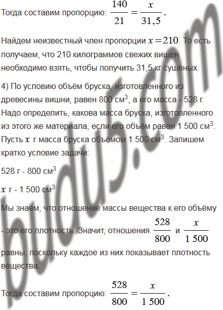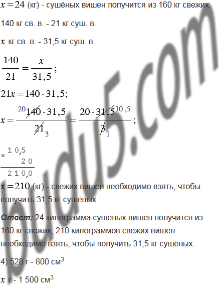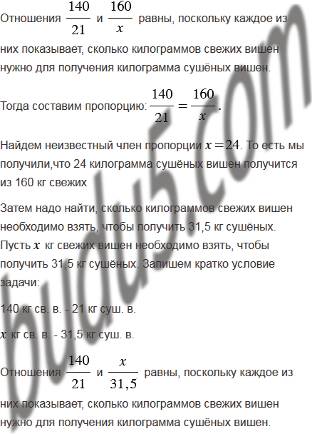 3) Из 140 кг свежих вишен получают 21 кг сушёных. Сколько килограммов сушёных вишен получится из 160 кг свежих? Сколько килограммов свежих вишен необходимо взять, чтобы получить 31,5 кг сушёных?