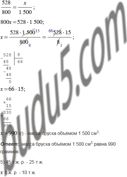 4) Объём бруска, изготовленного из древесины вишни, равен 800 см3, а его масса - 528 г. Какова масса бруска, изготовленного из этого же материала, если его объём равен 1 500 см3?