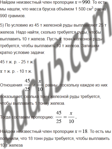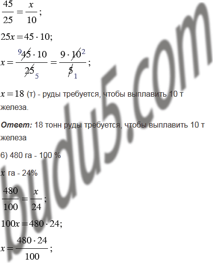 5) Из 45 т железной руды выплавляют 25 т железа. Сколько требуется руды, чтобы выплавить 10 т железа?