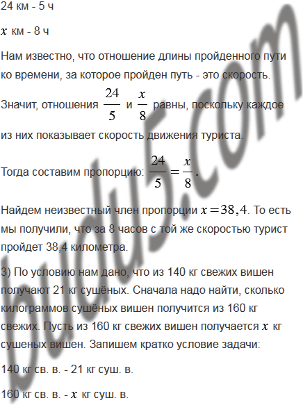 2) За 5 ч турист прошёл 24 км. Какое расстояние он пройдет за 8 ч с той же скоростью?