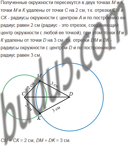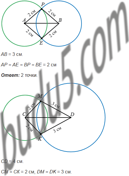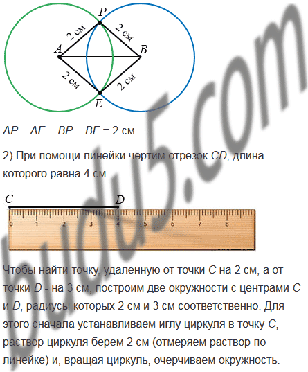 2) Начертите отрезок СD, длина которого равна 4 см. Найдите точку, удаленную от точки С на 2 см, а от точки D - на 3 см. Сколько существует таких точек?