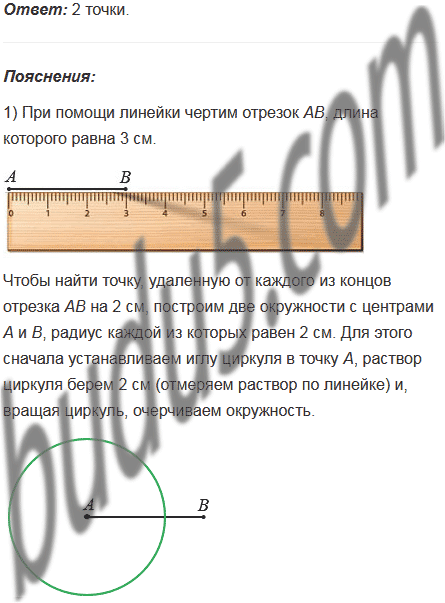 1) Начертите отрезок АВ, длина которого равна 3 см. Найдите точку, удаленную от каждого из концов отрезка АВ на 2 см. Сколько существует таких точек?