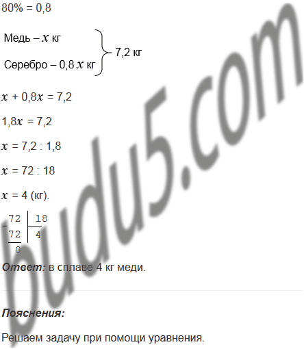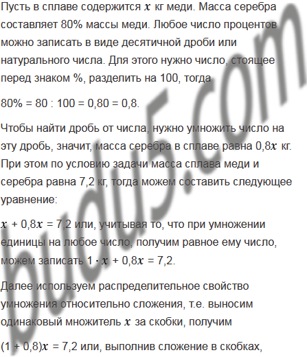 Масса сплава меди и серебра равна 7,2 кг. Масса серебра составляет 80% массы меди. Сколько килограммов меди в сплаве?