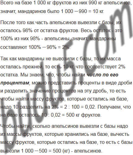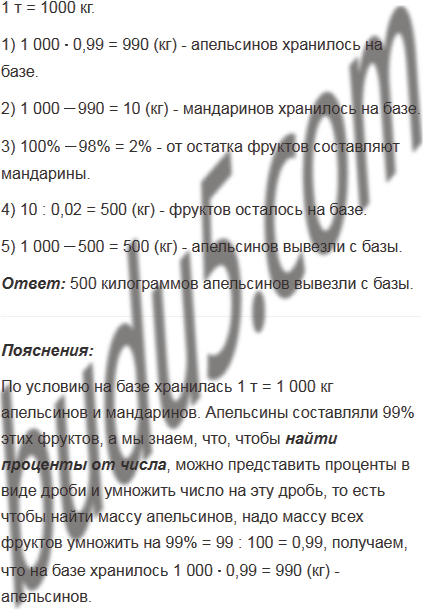 На базе хранилась 1 т апельсинов и мандаринов. Апельсины составляли 99% этих фруктов. Сколько килограммов апельсинов вывезли с базы, если их осталось 98% от остатка фруктов?