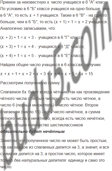 В школе шесть 6 классов. В 6 "Б" классе учащихся на одно больше, чем в 6 "А", в 6 "В" - на одного больше, чем в 6 "Б", и так далее. Укажите, каким из следующих чисел обязательно будет общее количество шестиклассников: 1) простым числом; 2) чётным числом; 3) нечётным числом.