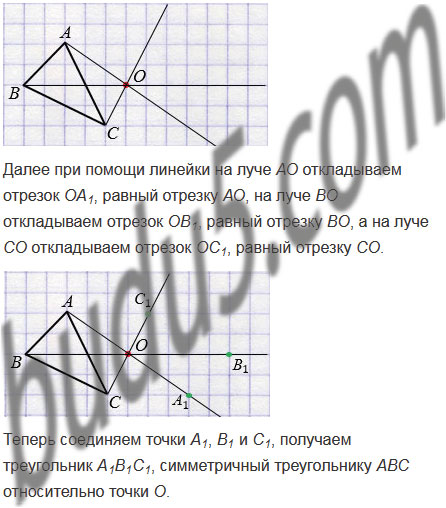 Перерисуйте рисунок 158 в тетрадь и постройте фигуру, симметричную треугольнику АВС относительно точки О.