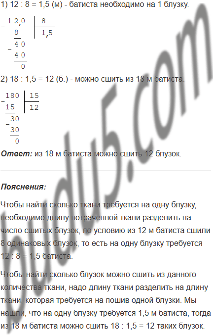 Из 12 м батиста сшили 8 одинаковых блузок. Сколько таких блузок можно сшить из 18 м батиста?