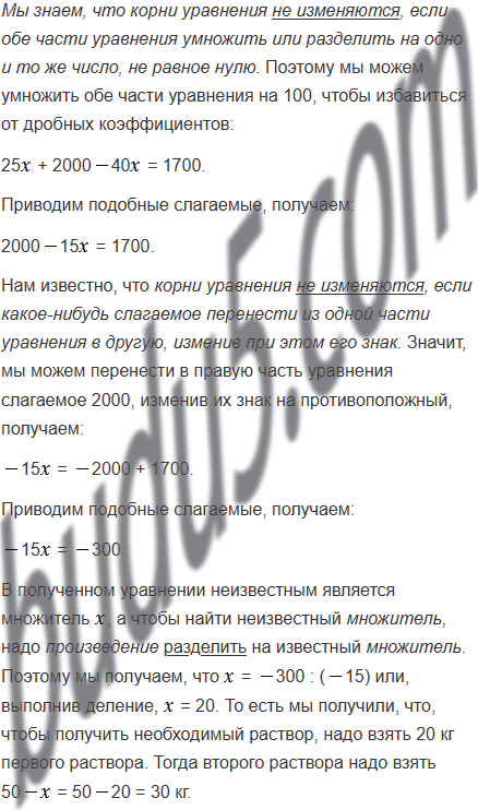 Есть два водно-солевых раствора. Первый раствор содержит 25%, а второй - 40% соли. Сколько килограммов каждого раствора надо взять, чтобы получить раствор массой 50 кг, содержащий 34% соли?