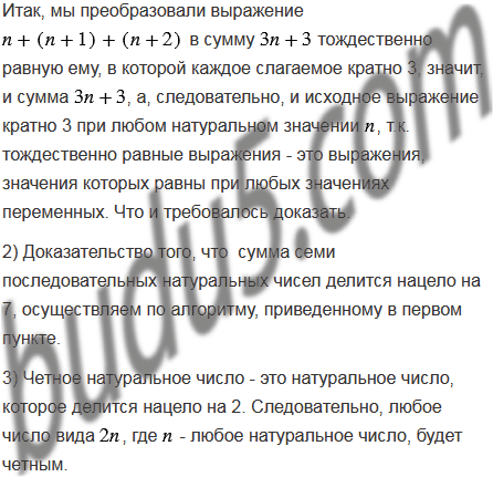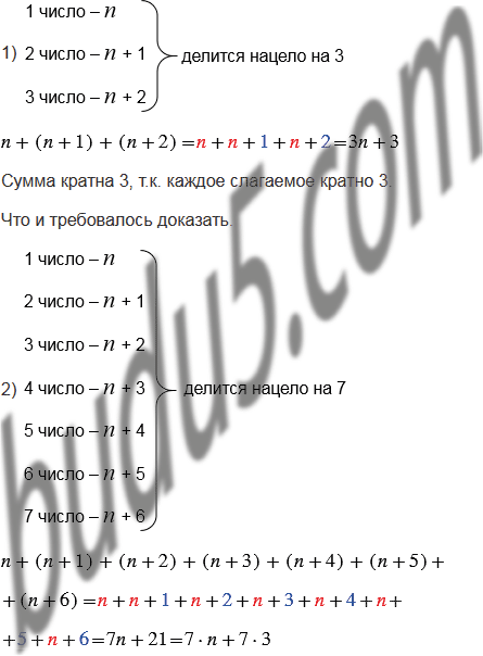 2) сумма семи последовательных натуральных чисел делится нацело на 7;