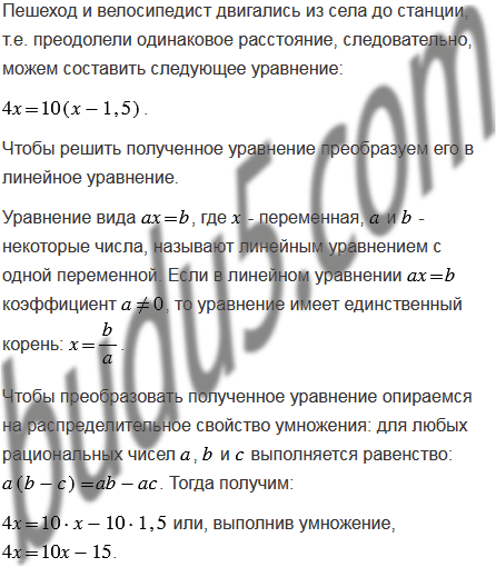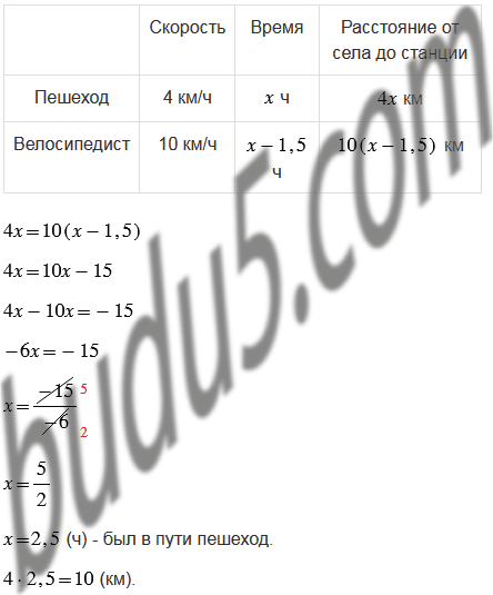 Из села в направлении станции вышел пешеход со скоростью 4 км/ч. Через час из села со скоростью 10 км/ч выехал велосипедист, который прибыл на станцию на 0,5 ч раньше пешехода. Какое расстояние от села до станции?