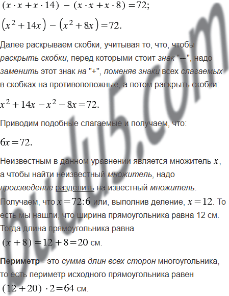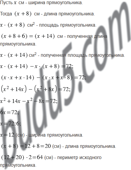 Ширина прямоугольника на 8 см меньше его длины. Если длину прямоугольника увеличить на 6 см, то его площадь увеличится на 72 см2. Найдите периметр данного прямоугольника.