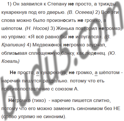 1) Он заявился к Степану (не)просто а трижды кукарекнув под его дверью. (В. Осеева) 2) Все эти слова можно было произн..сить (не)громко, а ш..потом. (Н. Носов) 3) Женька повторил (не)громко но упрямо: «Я всё равно бы (не) испугался». (В. Крапивин) 4) Медвеж..нок (не)громко заурчал, облиз..вая сплюще(н, нн)ую банку, как лед..нец. (Ю. Коваль)
