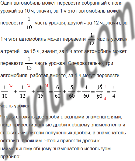 Один автомобиль может перевезти собранный с поля урожай за 10 ч, другой - за 12 ч, а третий - за 15 ч. За сколько часов они смогут перевезти урожай, работая вместе?