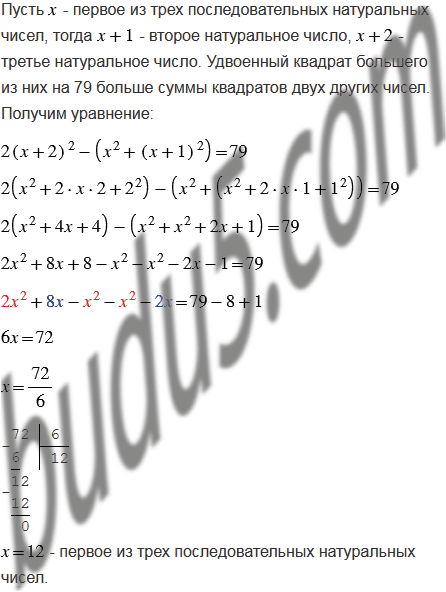 Найдите три последовательных натуральных числа, если удвоенный квадрат большего из них на 79 больше суммы квадратов двух других чисел.