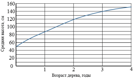 На графике приведена зависимость между возрастом дерева и его средней высотой. По горизонтальной оси откладывается возраст дерева в годах, по вертикальной - его средняя высота в сантиметрах. По графику определите, через сколько лет высота дерева будет равна 130 см.
