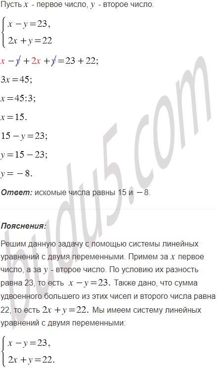 Найдите два числа, если их разность равна 23, а сумма удвоенного большего из этих чисел и второго числа равна 22.