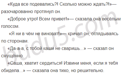 | «Куда все подевались?! Сколько можно ждать?!» «Доброе утро! Всем привет!» «Я ни в чём не виноват!» «Да-а-а, с тобой каши не сваришь...» «Саша, хватит сердиться! Извини меня, если я тебя обидела...» | — разочарованно протянул он. — сказала она тихо, но решительно. — кричал он, оглядываясь по сторонам. — сказала она весёлым голосом. — сказал он смущённо. |