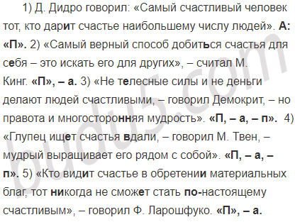 1) Самый счастливый человек тот кто дар..т счастье наибольшему числу людей. (Д. Дидро) 2) Самый верный способ добит(?)ся счастья для с..бя это искать его для других. (М. Кинг) 3) Не т..лесные силы и не деньги делают людей счастливыми но правота и многосторо(н, нн)яя мудрость. (Демокрит) 4) Глупец ищ..т счастья (в)дали мудрый выращивает его рядом с собой. (М. Твен) 5) Кто вид..т счастье в обретени.. материальных благ тот (н..)когда не смож..т стать (по)настоящему счастливым. (Ф. Ларошфуко)