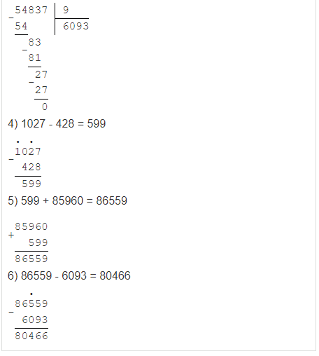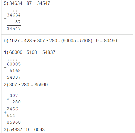 | б) 1027 - 428 + 307 • 280 - (60005 - 5168) : 9 |