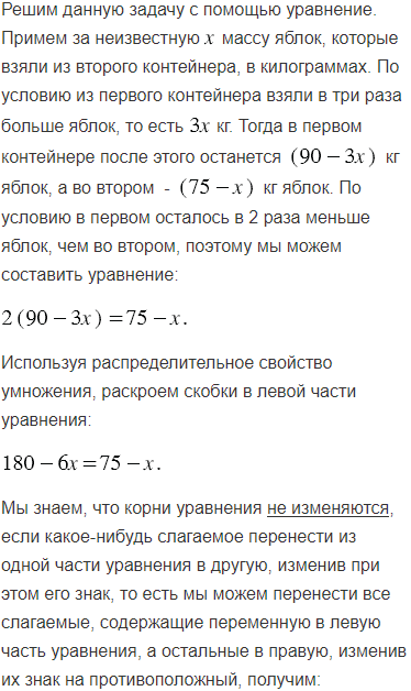В одном контейнере было 90 кг яблок, а в другом - 75 кг. После того как из первого контейнера взяли в три раза больше яблок, чем из второго в первом осталось в 2 раза меньше яблок, чем во втором. Сколько килограммов яблок взяли из первого контейнера?