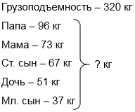 Грузоподъемность лифта 320 кг. Сможет ли в нем поехать семья из пяти человек, если папа весит 96 кг, мама 73 кг, старший сын - 67 кг, дочь - 51 кг и младший брат 37 кг?