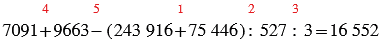 7091 + 9663 - (243 916 + 75 446):527:3.