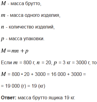 Масса М товара с упаковкой (ее называют массой брутто) состоит из массы товара (нетто) и массы упаковки (тары). Запишите это правило в виде формулы, если масса одного изделия равна и в упаковке изделий. Вычислите по формуле массу брутто ящика, в котором 20 кастрюль, массой 800 г каждая, а масса ящика 3 кг.