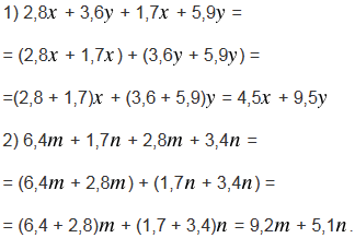 Чтобы упростить выражения, используем переместительное и сочетательное свойства сложения, то есть группируем слагаемые, содержащие одинаковую букву, далее к каждой группе слагаемых применяем распределительное свойство умножения относительно сложения, то есть выносим за скобки букву и выполняем сложение в скобках.