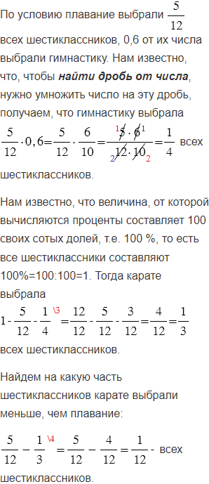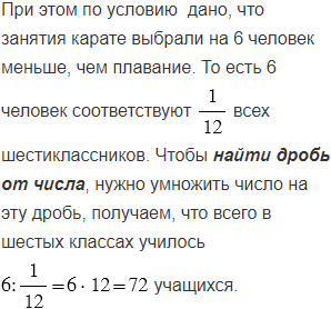 всех шестиклассников, 0,6 от их числа выбрали гимнастику, а остальные - карате. Сколько всего учащихся в шестых классах, если занятия карате выбрали на 6 человек меньше, чем плавание?