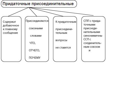 Придаточные присоединительные содержат добавочное сообщение и прикрепляются к главному союзными словами что, почему, отчего, например: 1) В город мы уехали вместе, что было вполне естественно. (Р. Казакова) 2) Морозы стояли лютые, отчего и погибли сады. (В. Песков)