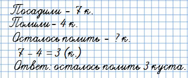 Мама с Юлей посадили 7 кустов смородины. Затем они полили 4 куста.