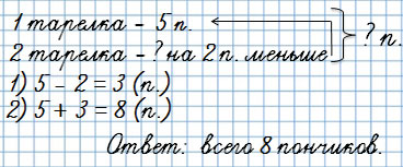 Бабушка испекла пончики и разложила их по тарелкам. На первую тарелку она положила 5 пончиков, а на вторую на вторую на 2 пончика меньше.