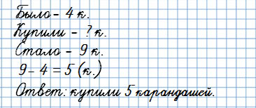 У Саши было 4 карандаша. Когда ему купили еще несколько карандашей, у него их стало 9.
